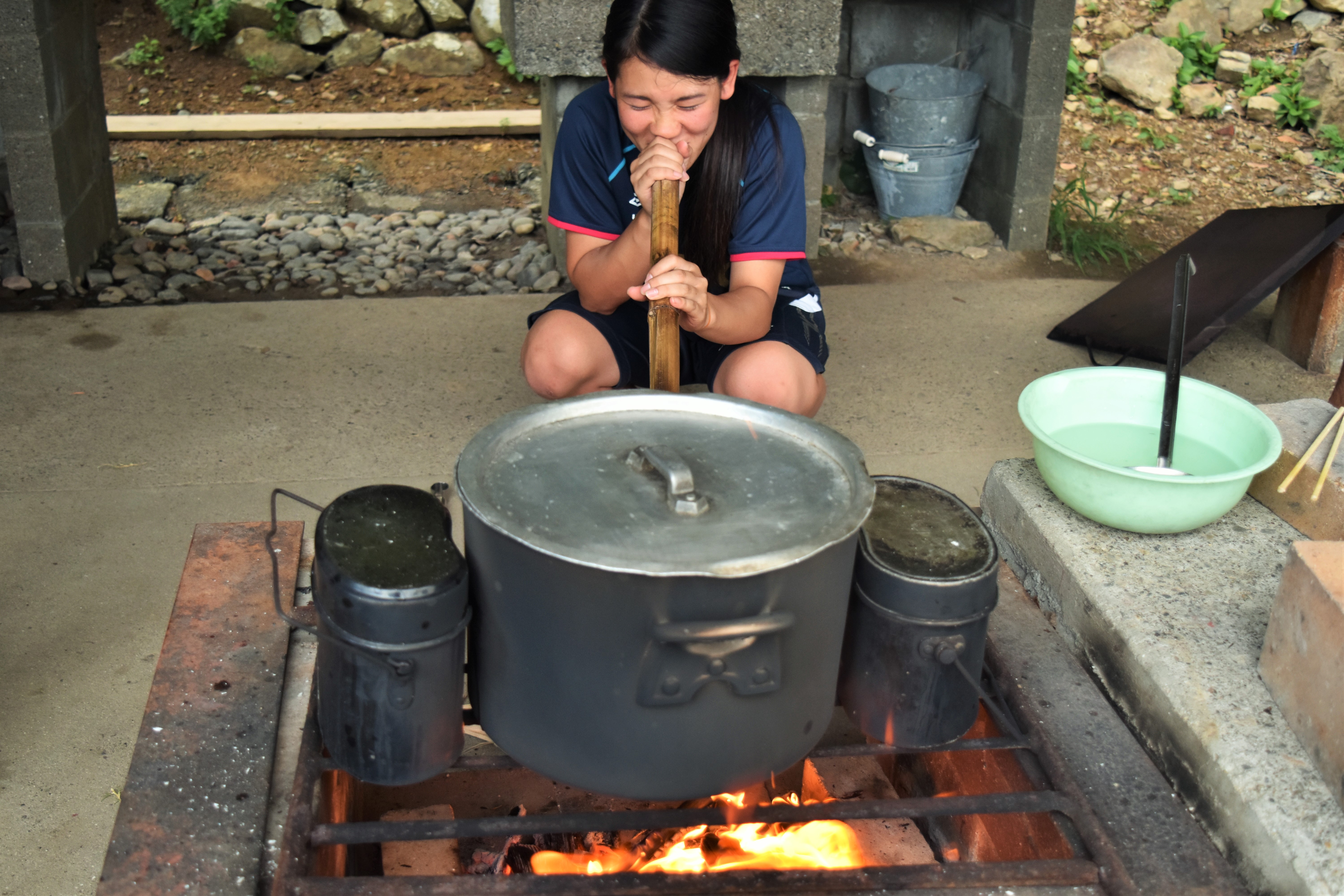 薪割りも、飯ごうでお米を炊くのも、普段の生活ではなかなか経験しないこと。 何をしていても楽しいようでした。 陽が沈んでからは、お待ちかねのキャンプファイヤーです。 1日目の夜に2年生があれこれ案を出していた催しが行われます。 おもしろおかしい点火式から始まり、次々とゲームが進行していきました。