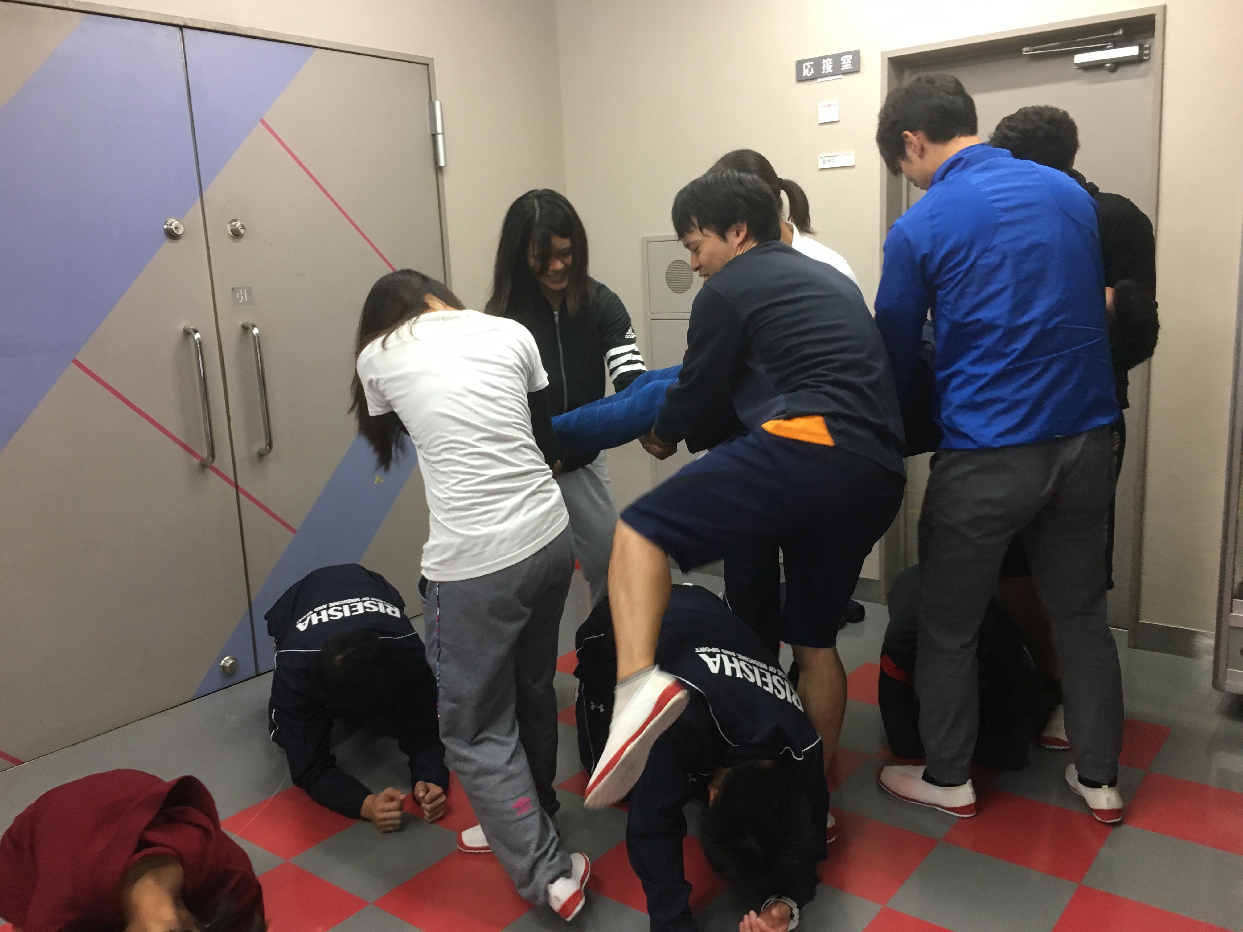 周りの学生も障害物の役をするなどして、運搬の難易度を上げています笑