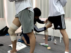 2020.10.14 テーピング授業~膝編~ 後期から始まったテーピングの授業ですが、 足首周辺のテーピングを終え、 今週から膝のテーピングが始まりました。 膝のテーピングでは、 一般的なホワイトテープと異なり、 伸縮性のあるテープを使用します。 学生も最初は違ったテープの扱いに 苦労していましたが、徐々に慣れ、 授業の後半ではスムーズに巻くことが 出来るようになっていました。 今月末の試験に向けて自主練習を 頑張っていただきたいと思います。 前の記事 記事一覧 次の記事