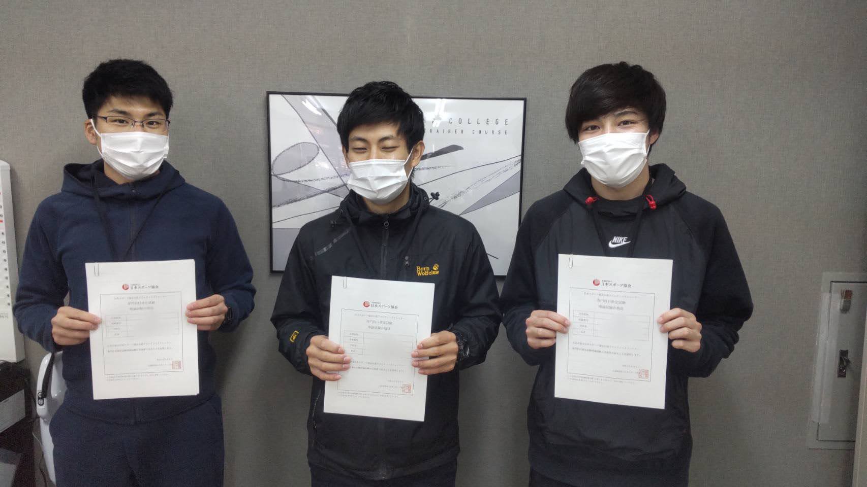 2020.12.08 理論試験 結果 先日、11月に行われた理論試験の結果が届きました。 今回はその合格者のみなさんの様子をご紹介いたします! アスレティックトレーナーコースからは4名の学生が合格いたしました。 それぞれが最後まで努力し続けた結果、合格することが出来ました。 次は実技試験に向けて頑張っていただきたいと思います。 前の記事 記事一覧 次の記事