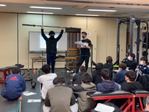 2021.03.09 2年生特別授業~Ⅱ~ 先週金曜日に引き続き昨日も2年生を対象とした特別授業がありました。 昨日はCFSC資格取得に向けた授業でもご指導いただいている、 永島先生にお越しいただき実施していただきました。 昨年授業で学んだ内容を現場で活用するための プログラム作成についてご指導いただきました。 2年生は1年ぶりのCFSCということもあり、 復習としても非常に貴重な時間となりました。 卒業後にはそれぞれの現場で活用していただきたいと思います! 前の記事 記事一覧 次の記事