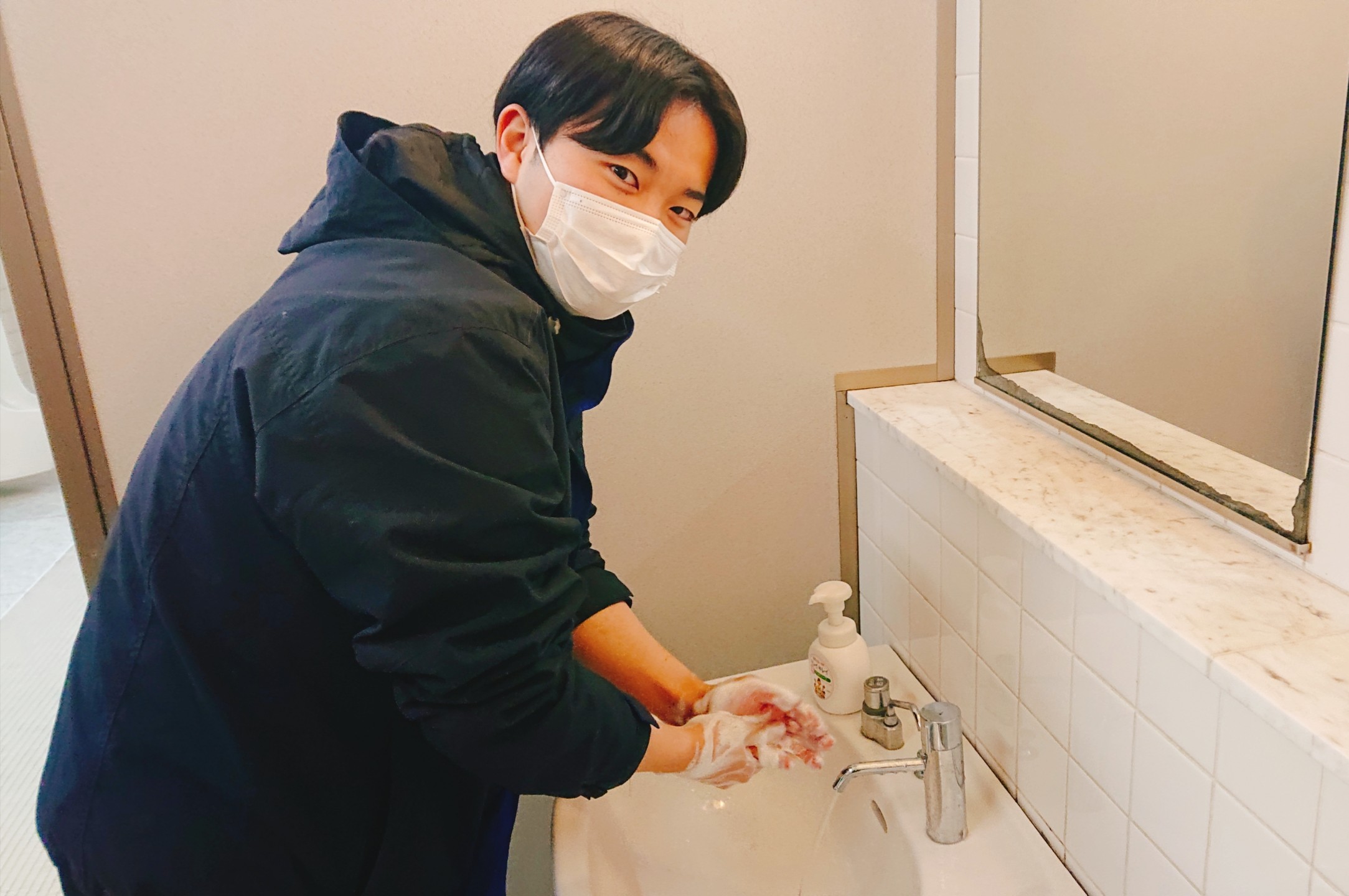 (写真:アスレティックトレーナー実習でしっかり手洗いを行う福原君)