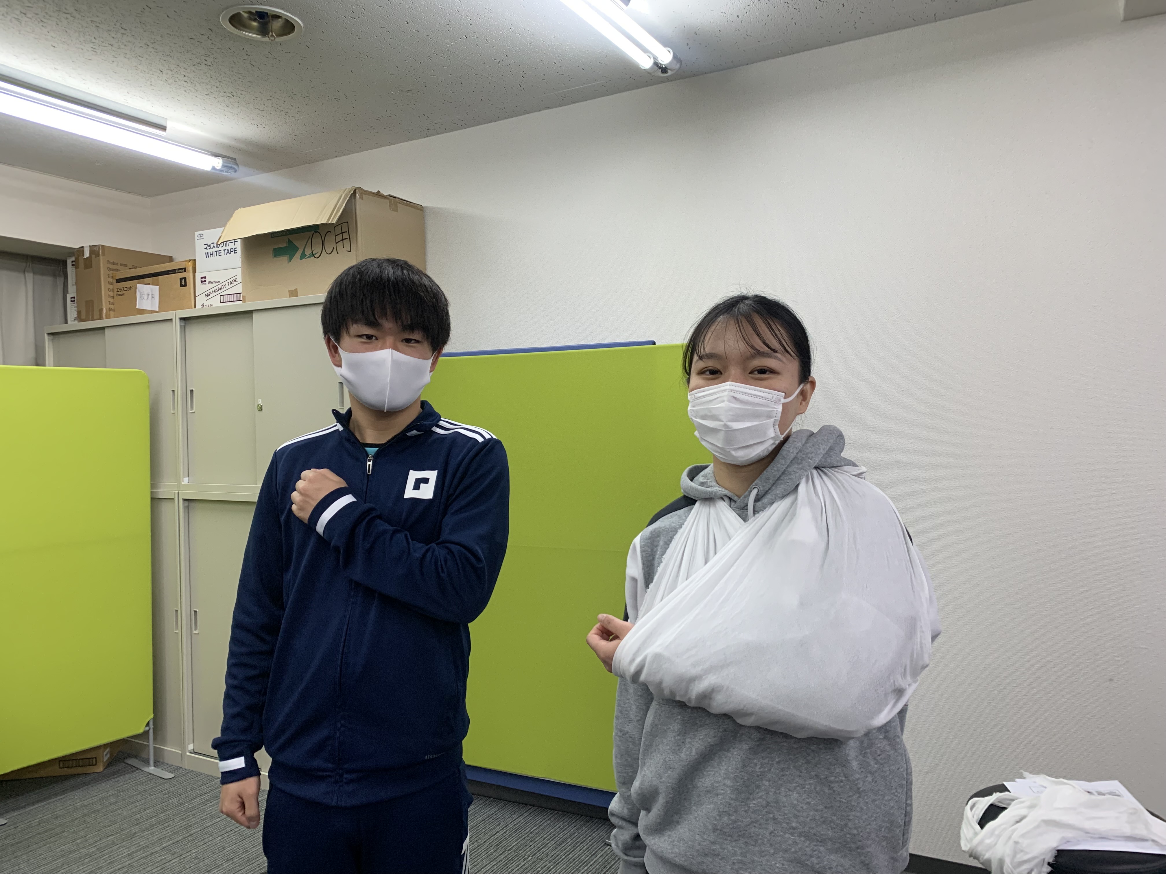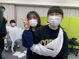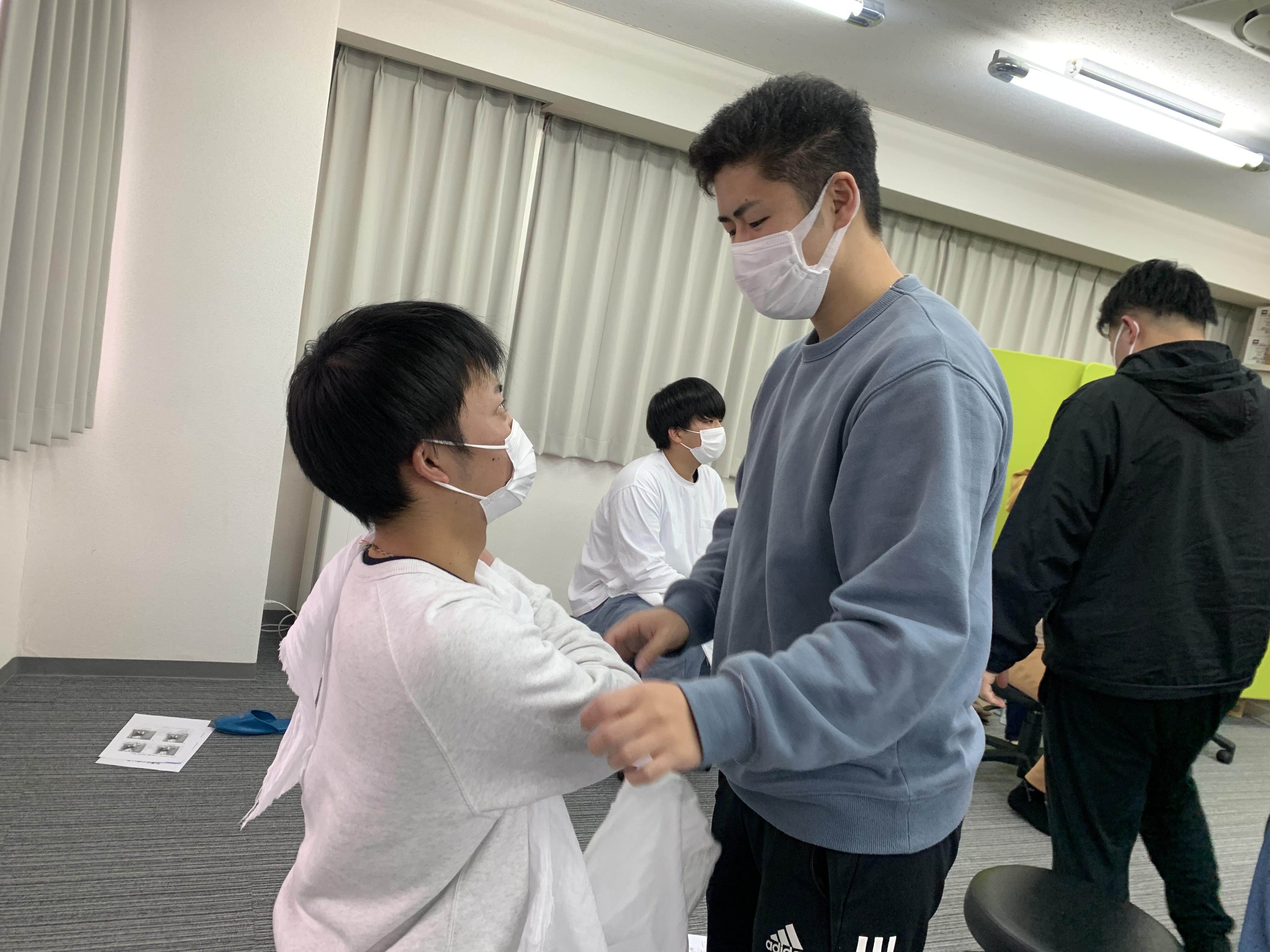 捻挫や脱臼、骨折をした際の包帯での固定や三角巾で腕をつる練習、膝の前十字靭帯を切った際などに膝を固定する二―ブレイス、首を固定するネックカラーの装着方法を学びました。