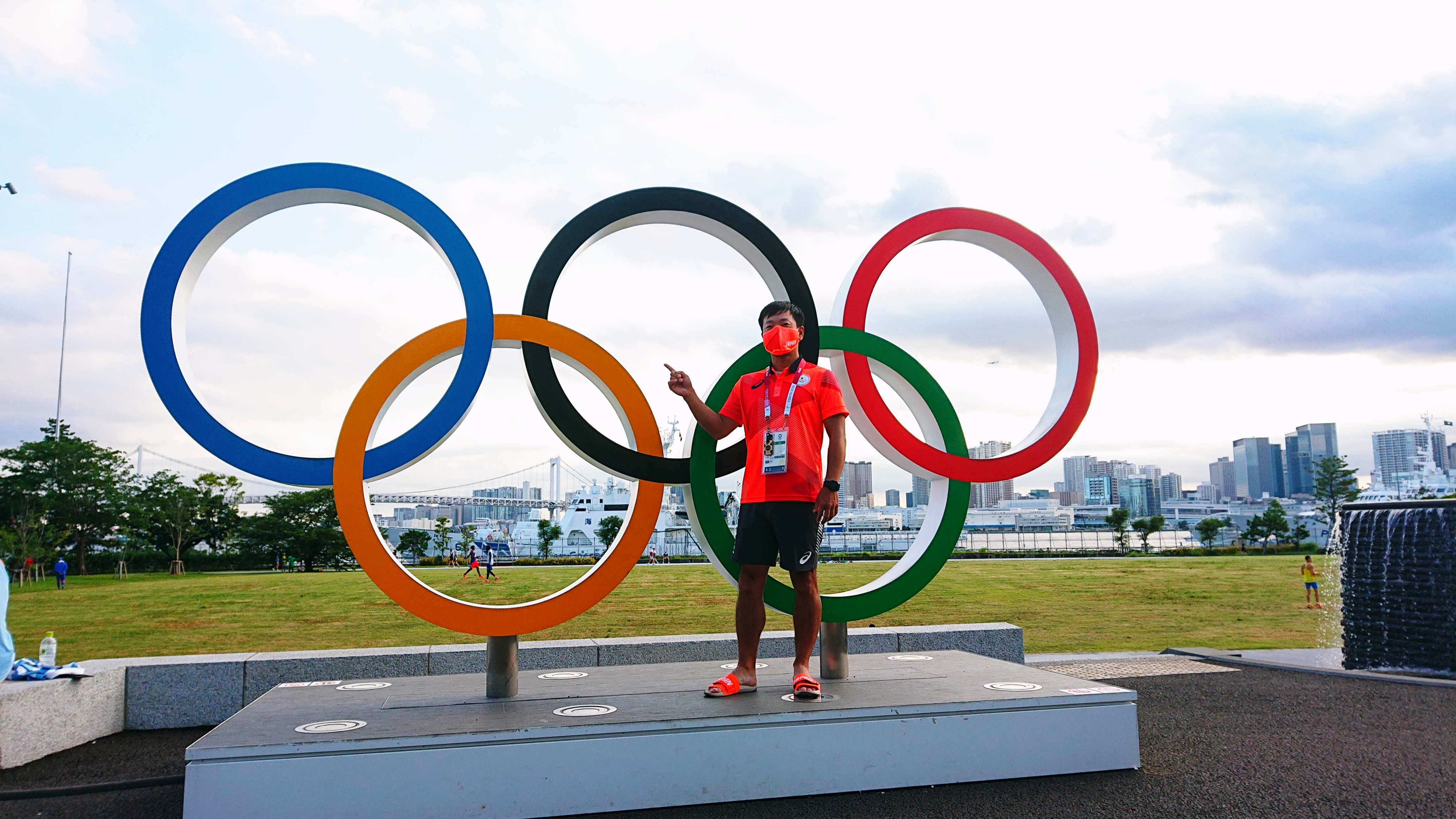 東京オリンピック選手村にて。日焼けで最高潮に真っ黒です。 (写真提供/部谷先生)
