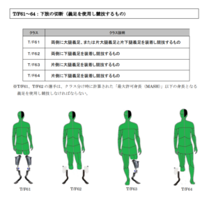 このように、同じ脚の障害でも障害部位が膝下かそれより上か(使用している義足の違い)でクラスが変わります。