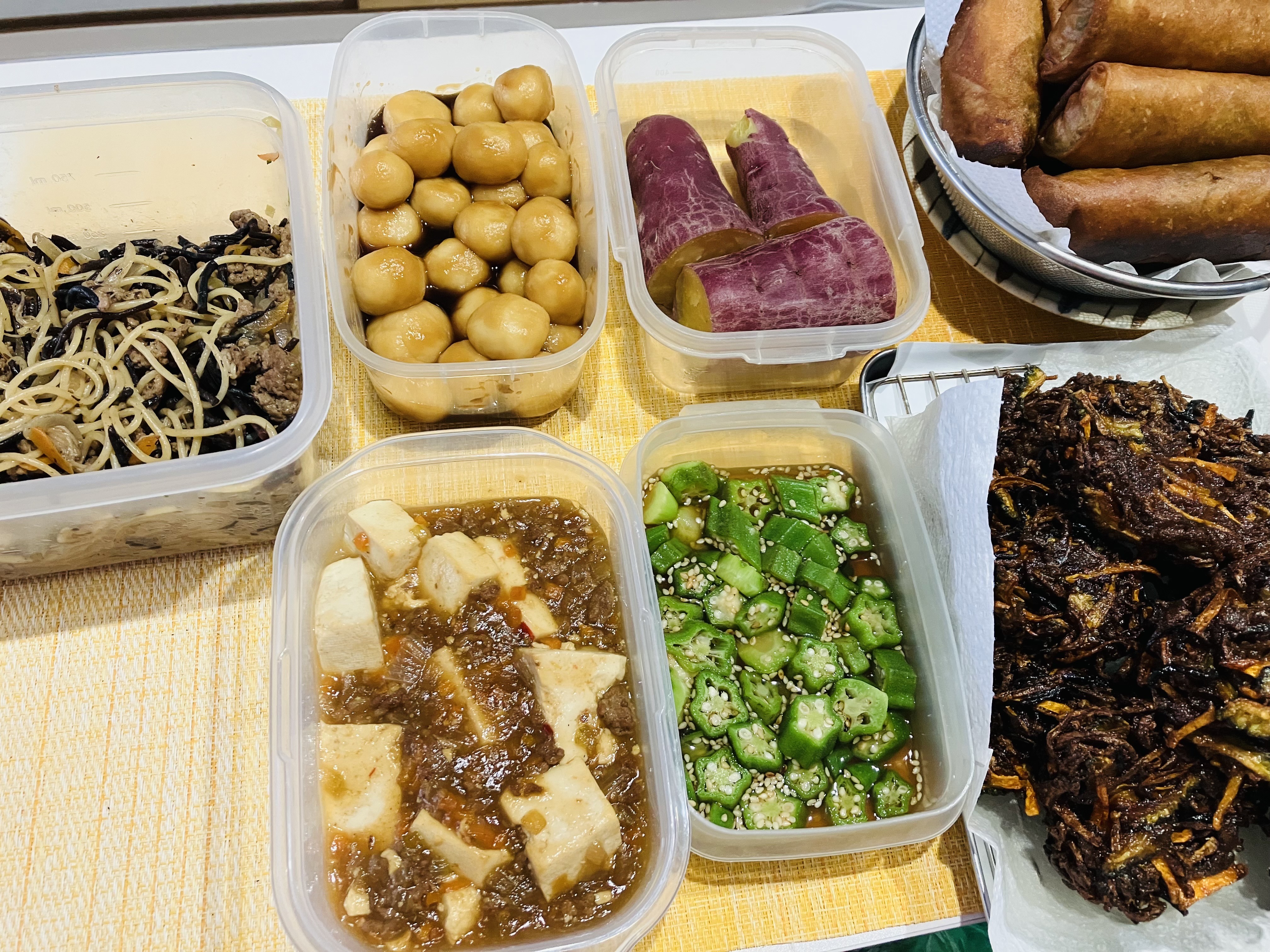 ひじきの和風パスタ、みたらし団子、焼き芋、野菜春巻き、豆腐のそぼろあんかけ、オクラのお浸し、切り干し大根とゴーヤのかき揚げ