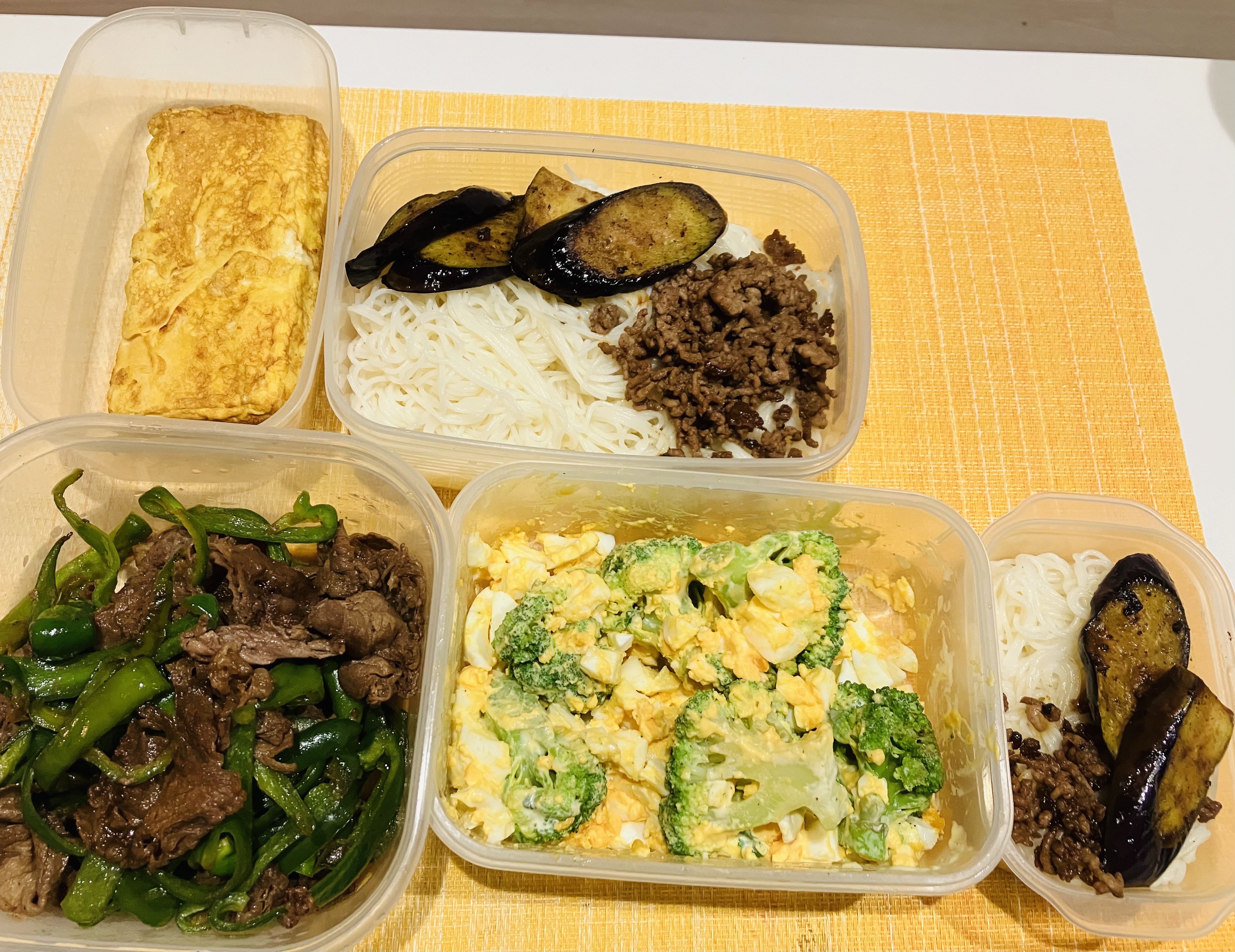 だし巻き、そうめんナスとひき肉のせ、肉とピーマンの炒め物、ブロッコリーと卵のサラダ
