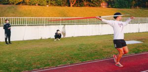 2年生がやり投げの選手の動作分析を行うのを1年生が見学していました。