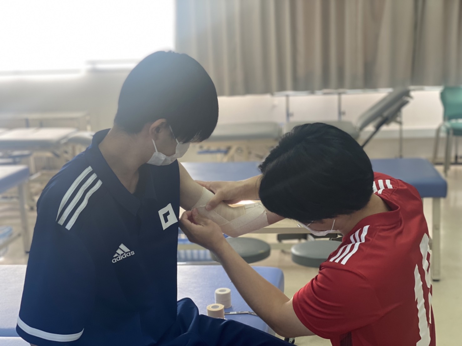 また、9月から1年生は現場実習の見学もスタートしており、各競技によってテーピングの種類・巻き方・ポイントが違うなど肌で感じ、テーピングの授業に関しての取り組みが前期より良くなっている印象です。授業で学んだ基礎が、現場での応用に繋がります。