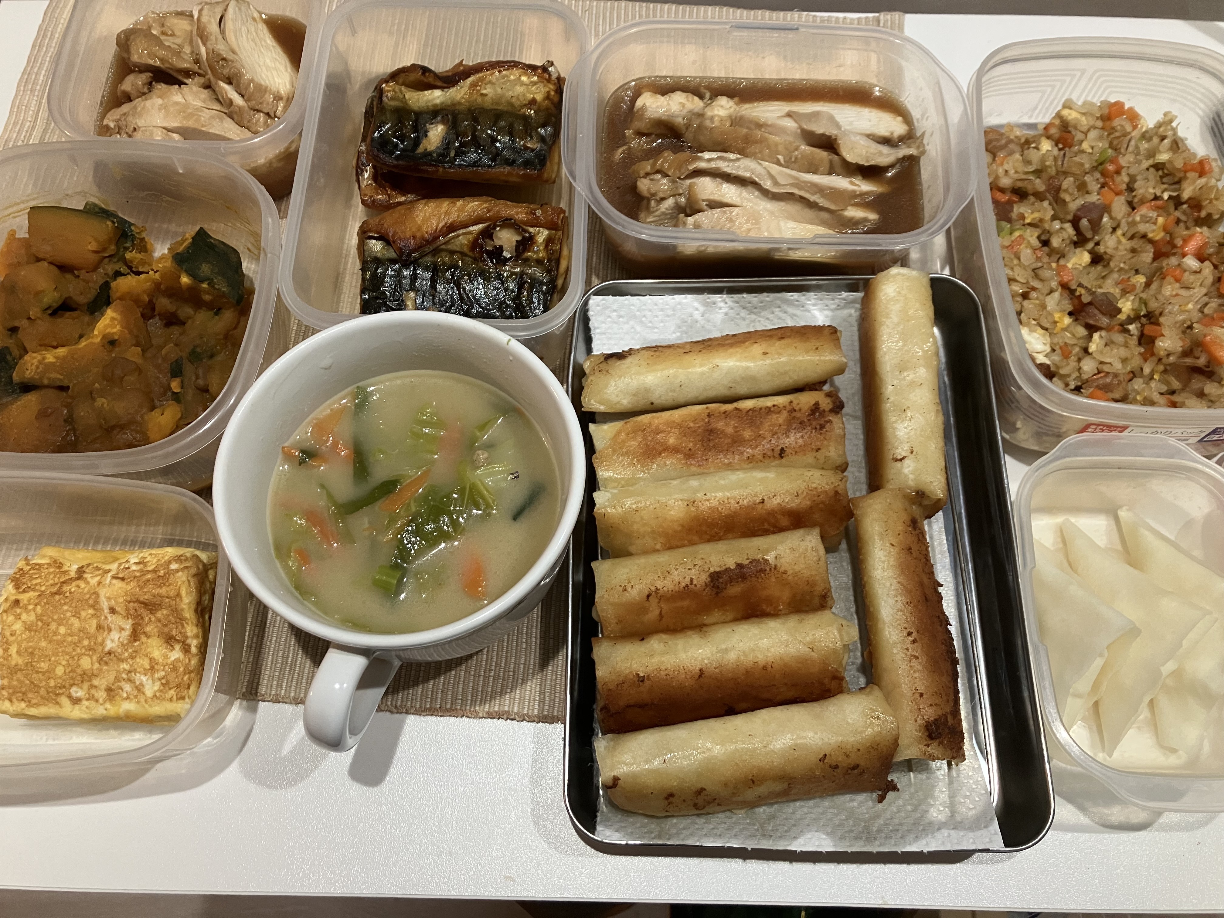 鶏むねチャーシュー、焼鯖、かぼちゃの胡麻煮、だし巻き卵、焼き豚チャーハン、ごま味噌スープ、バーコンポテト春巻き、チーズ春巻き