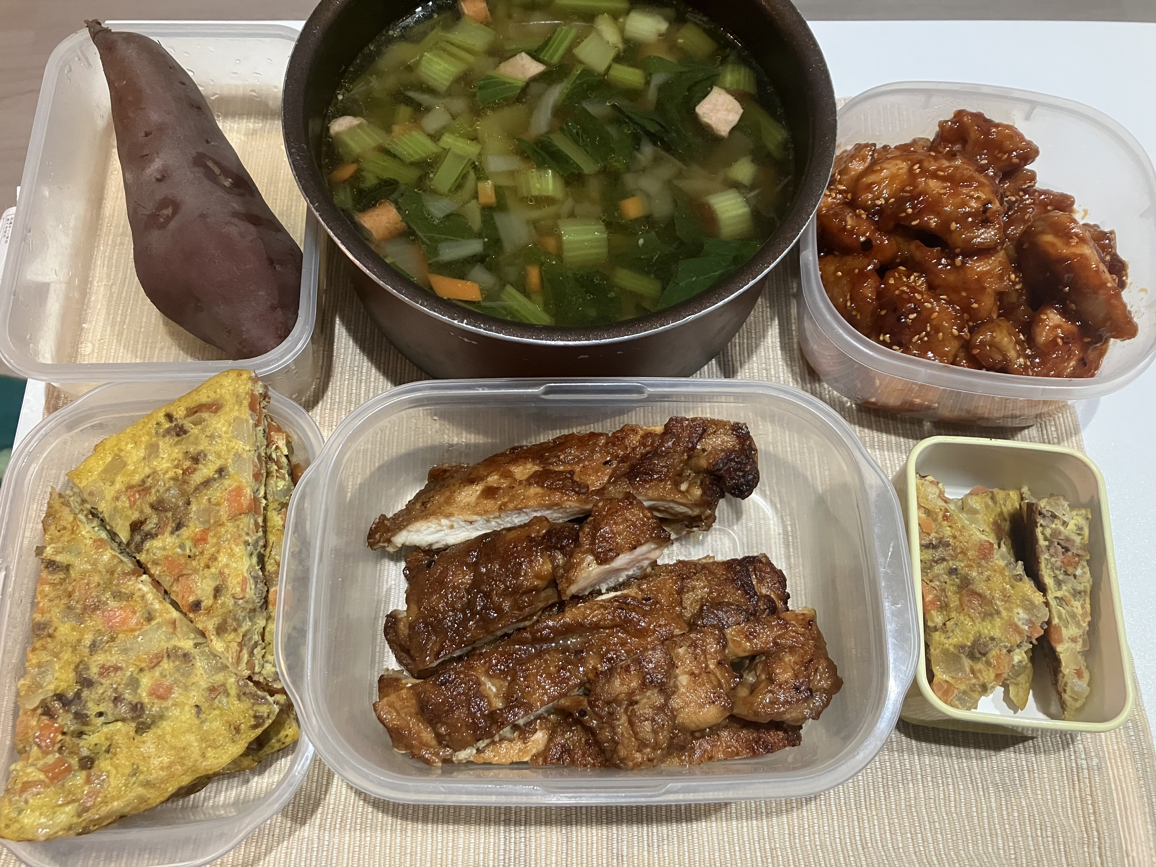焼き芋、コンソメスープ、ヤンニョムチキン、オムレツ、鶏むね漬けステーキ