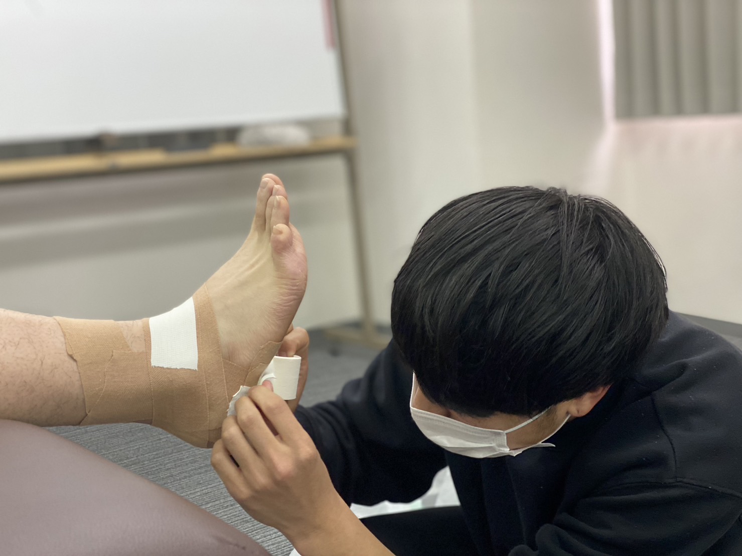 今回の実習内容は、ここ最近の実習で学生が、選手に求められることが増えてきたテーピングにしました。
