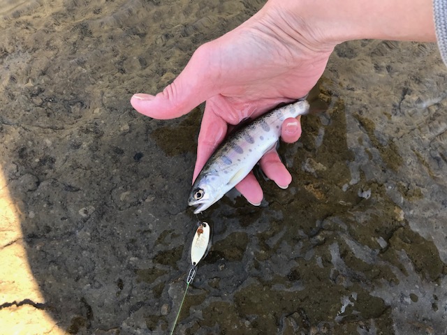 まだまだ小さいヤマメだったので、この後リリースしました~。基本は”キャッチ&リリース”なのでね、私のスタイル。