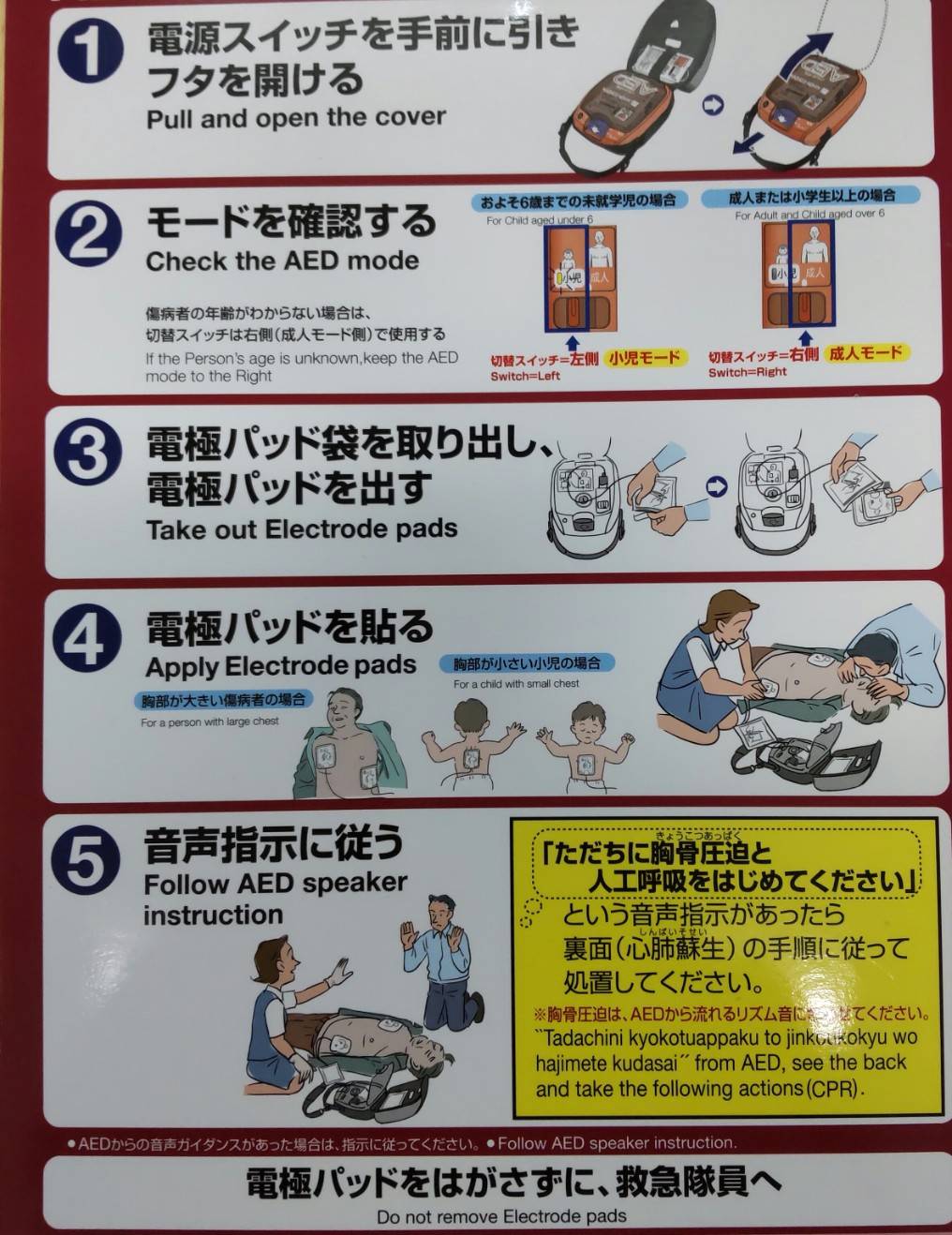 ちなみに、職員室のAEDにはこのような使い方説明書も一緒に