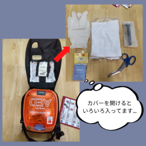 AED本体とともに、対応の際に使うであろう様々な用具が入っています。
