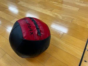これは、メディシンボールです。バスケ部は練習の前のw-upで毎回使用するため所有していますが、サッカー部は所有していません。でも、競技復帰前の選手に使わせたい。どうしますか?バスケ部は室内用として使用していますが、それを借りて外で使用しますか?