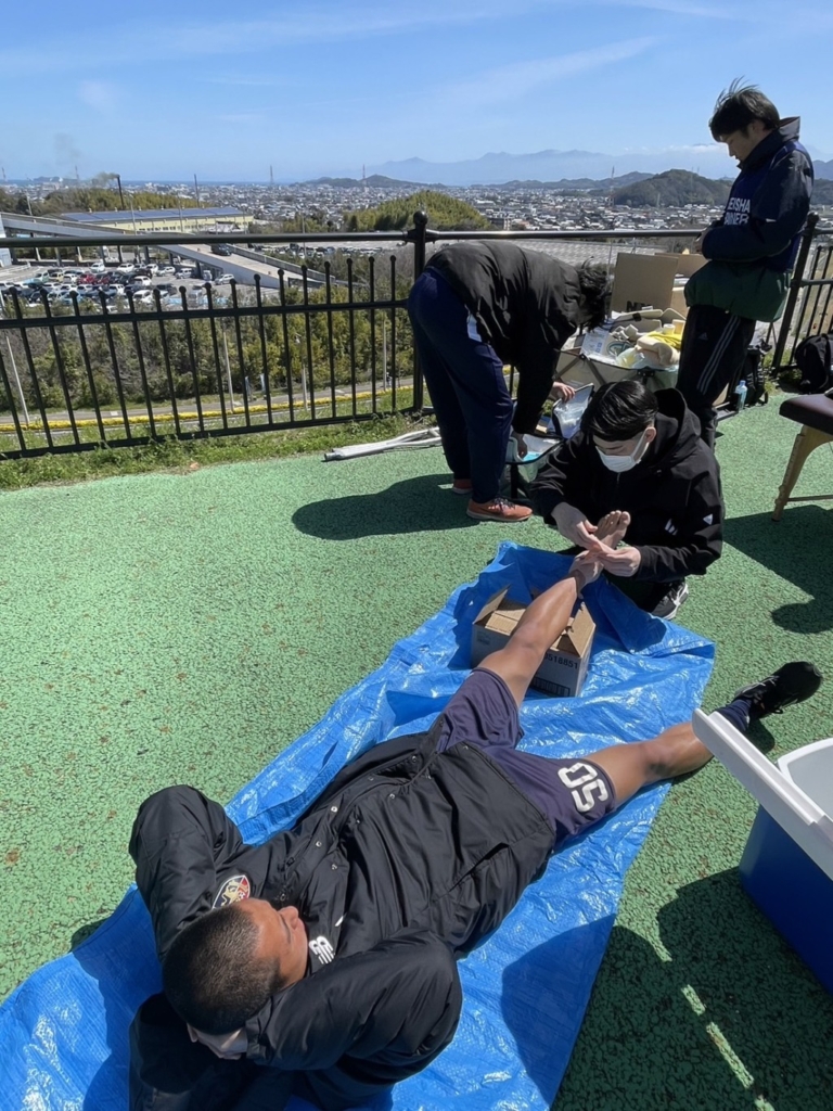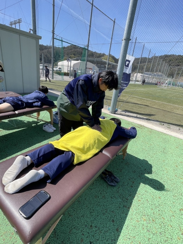 試合前のテーピングやストレッチ、体の疲労に対して考え選手のサポートをしていきます。