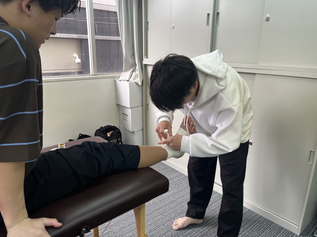 授業中の練習でtry&errorを繰り返し、何が原因でテーピングにシワができているのか、