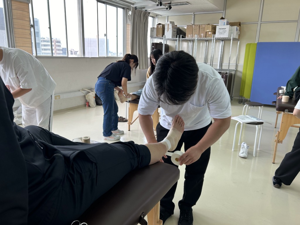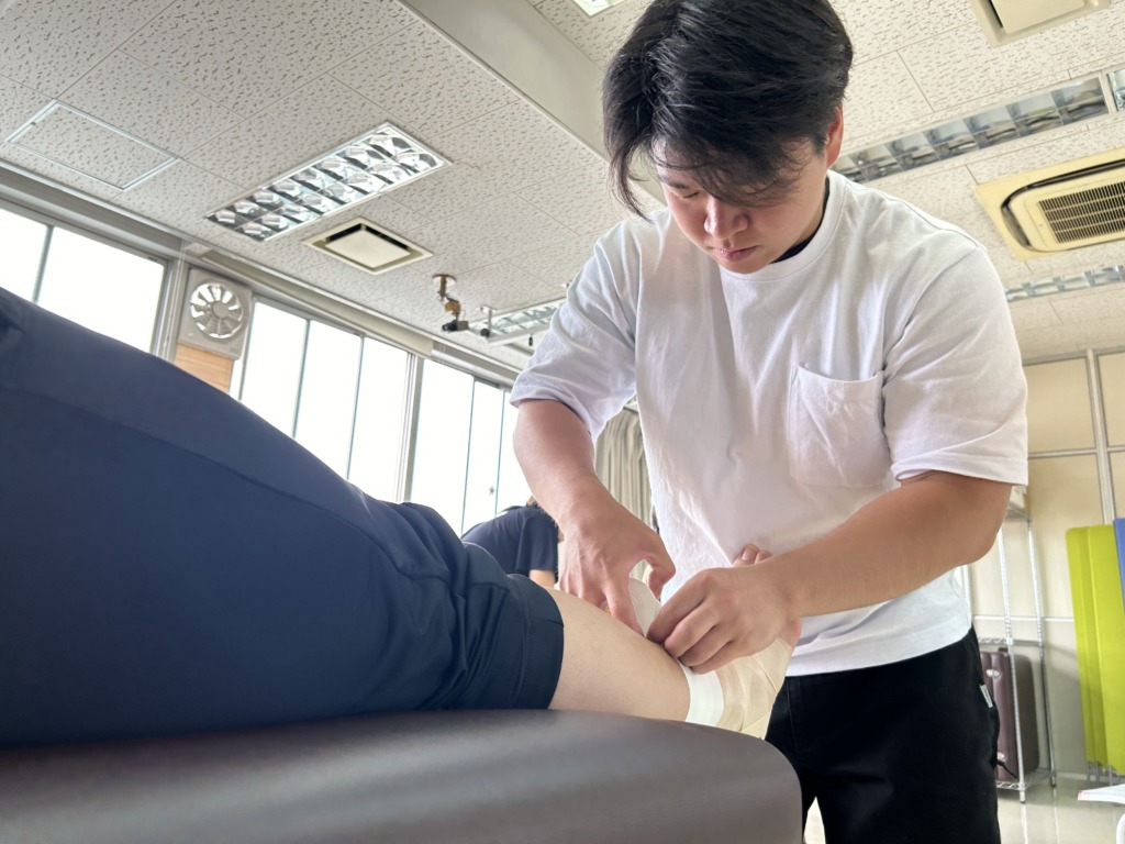 はじめはテーピングに慣れるために、何回も巻いて練習していきます。