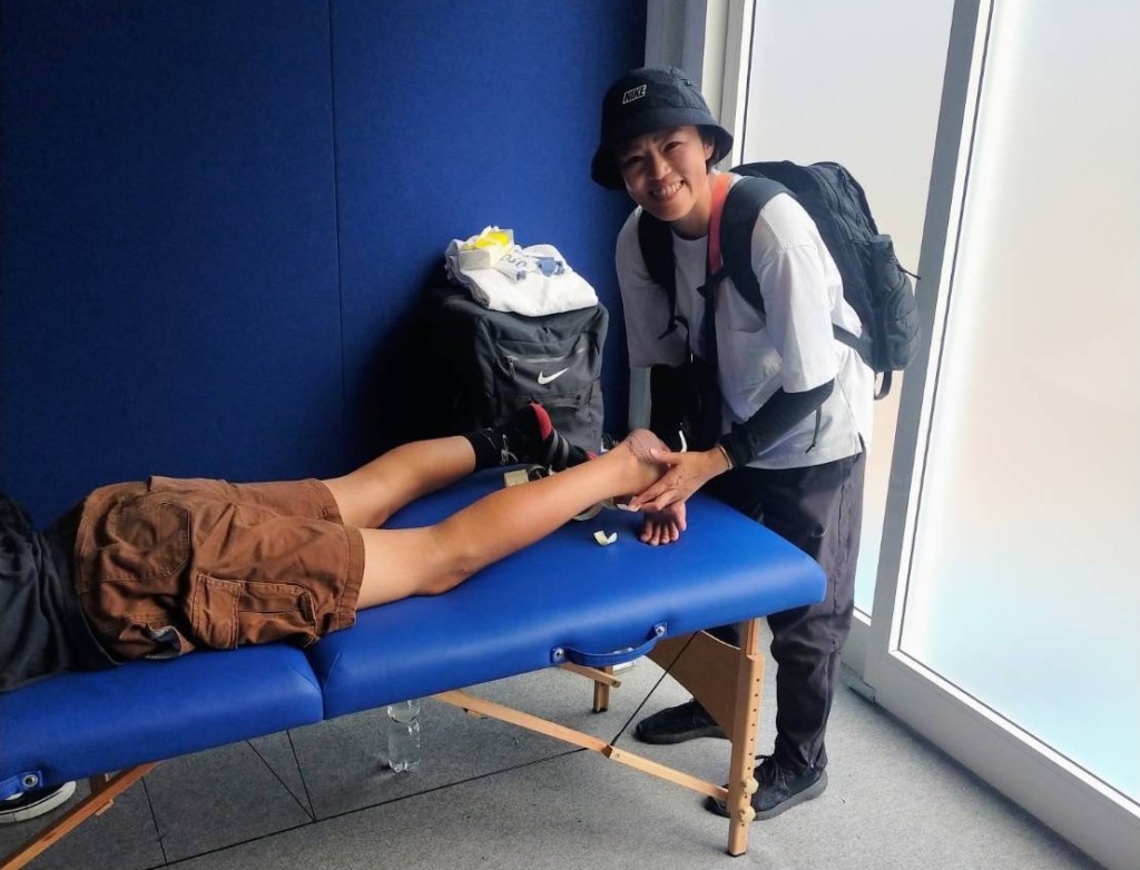 ↑ 大会期間中に大切な選手の足にテーピングを巻かせていただきました。リュックを下ろすことを忘れるぐらい緊張していたんだと思います。笑