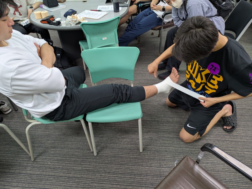 実習先でのスキルアップにつなげるためにテーピングの練習をする人