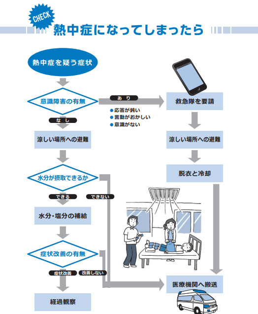 もし熱中症に出会った際には、基本的に以下の対応です。