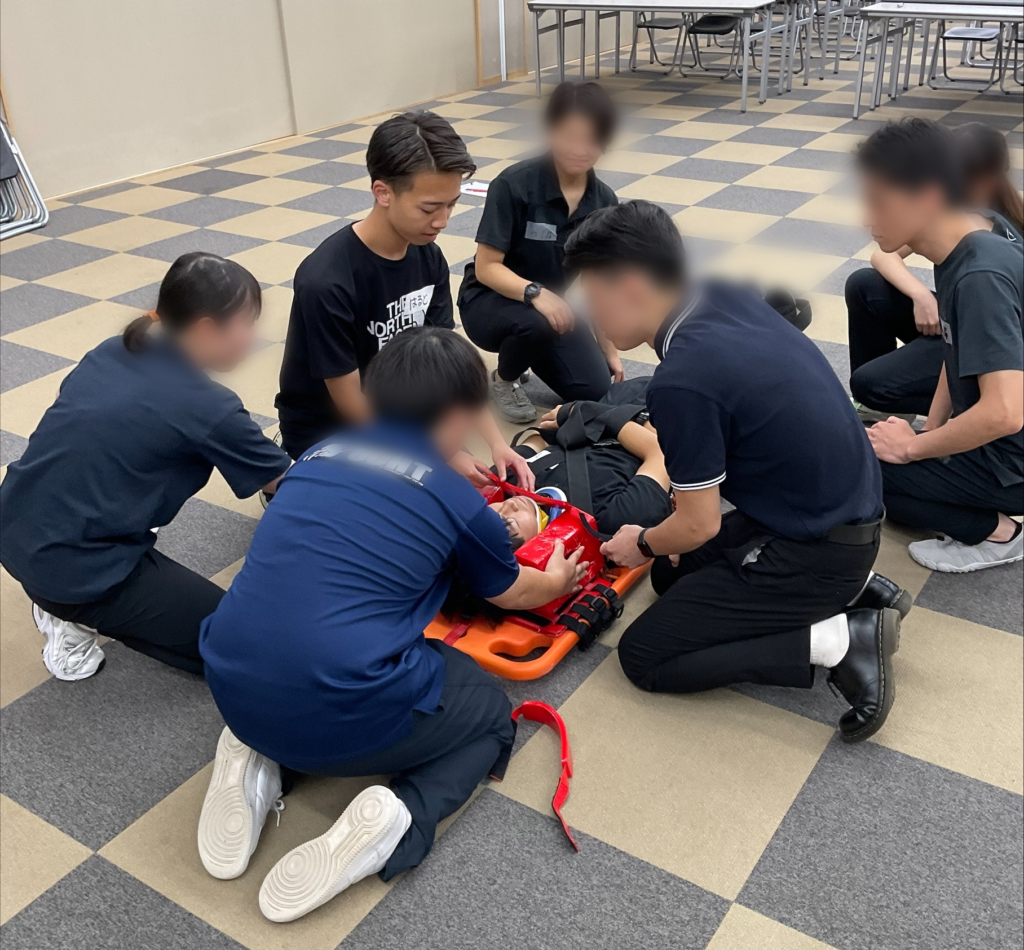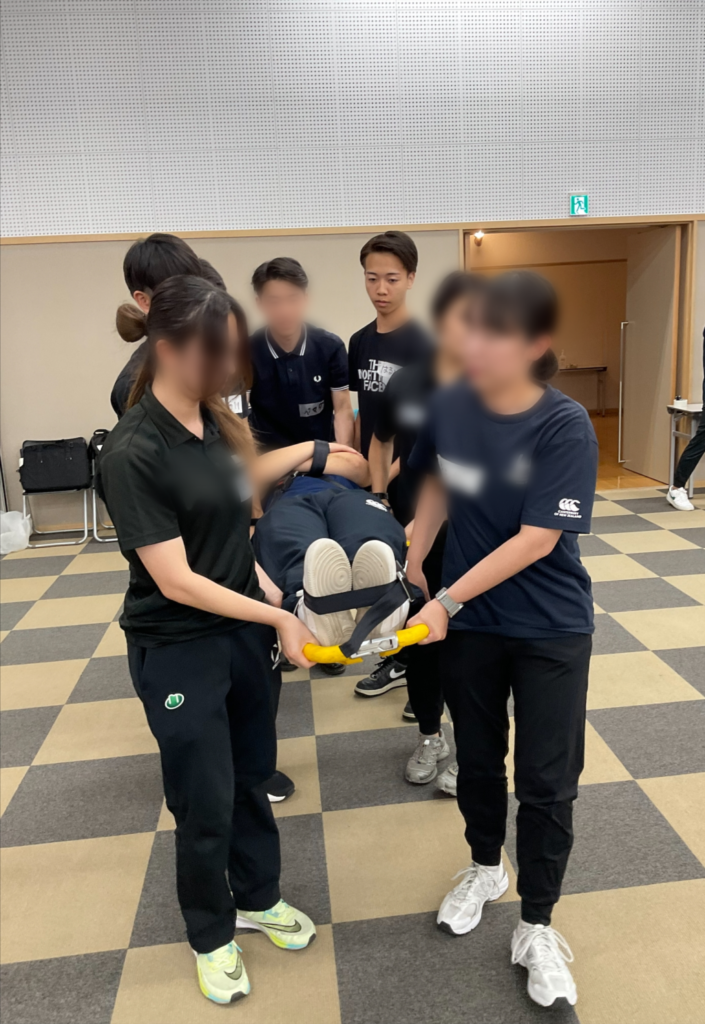 今回は倒れている選手をこれらに乗せて固定し、持ち上げて搬送するという練習をしました。