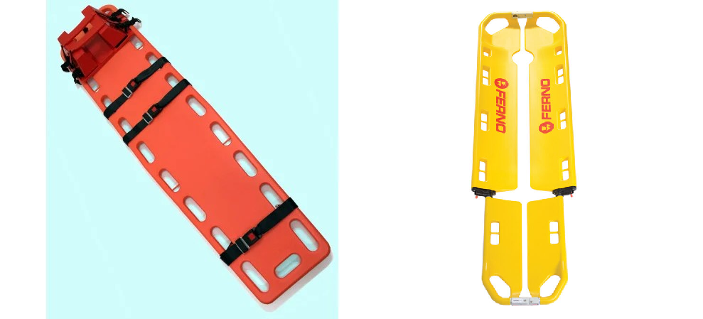 その際使われるのが、スパインボード(左)やスクープストレッチャー(右)です。