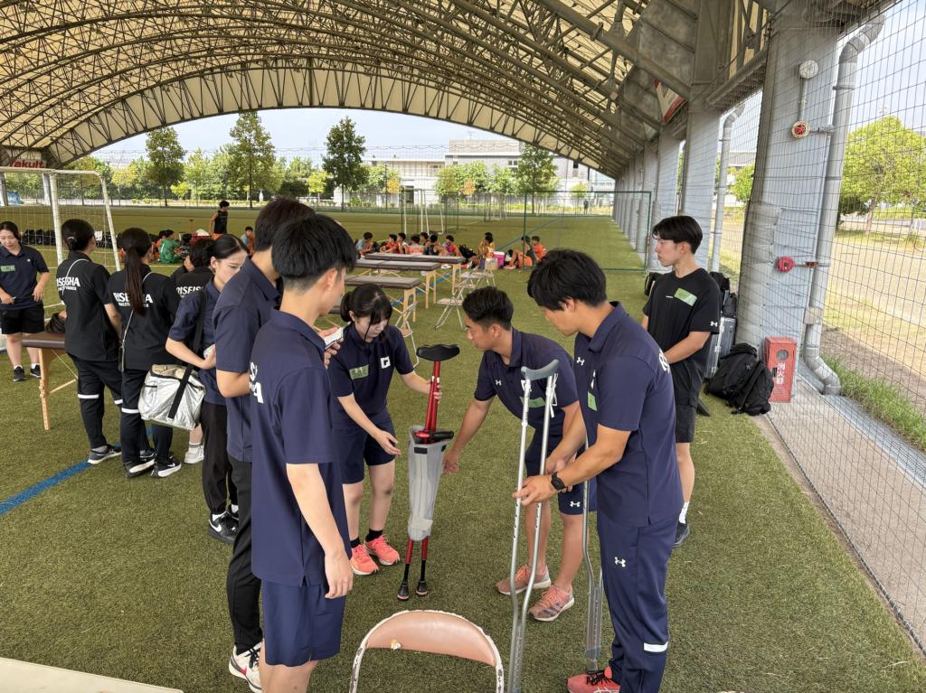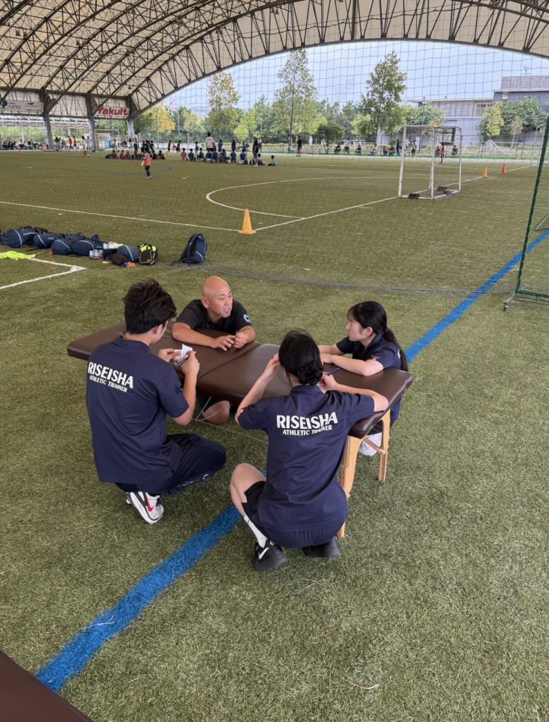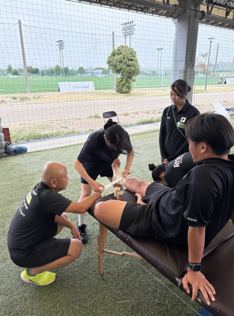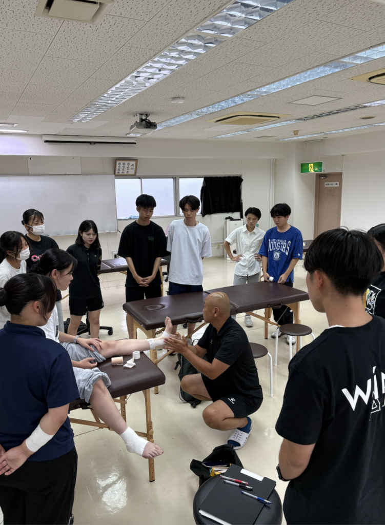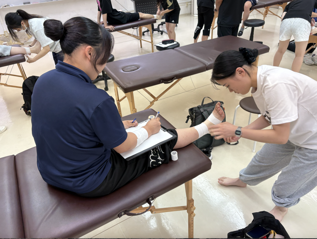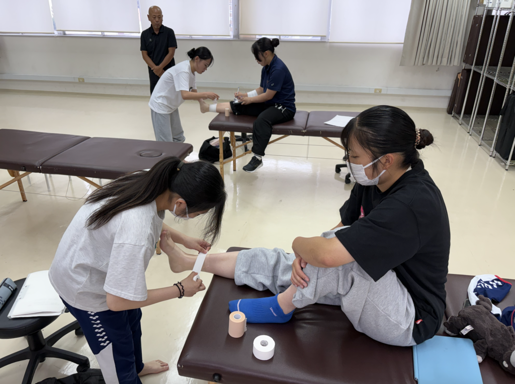 普段の練習とは違い、実際に痛みを抱えている選手にテーピングを巻く、受傷すぐの足関節捻挫の選手に対して処置をする。生徒は緊張して手が震えている様子も見れました。
