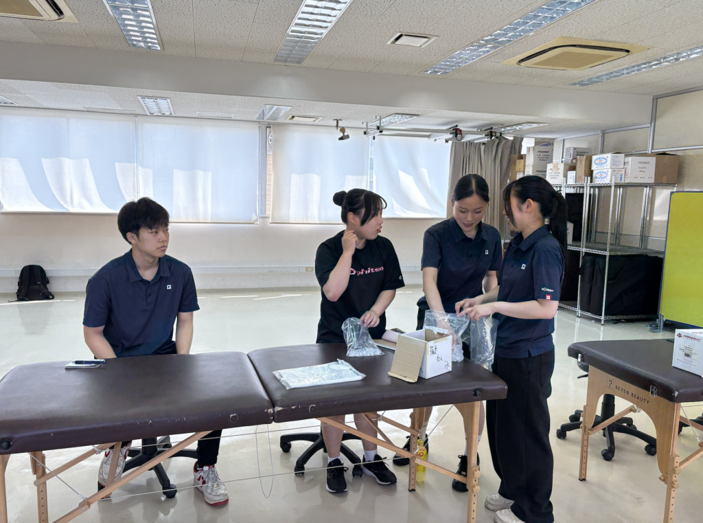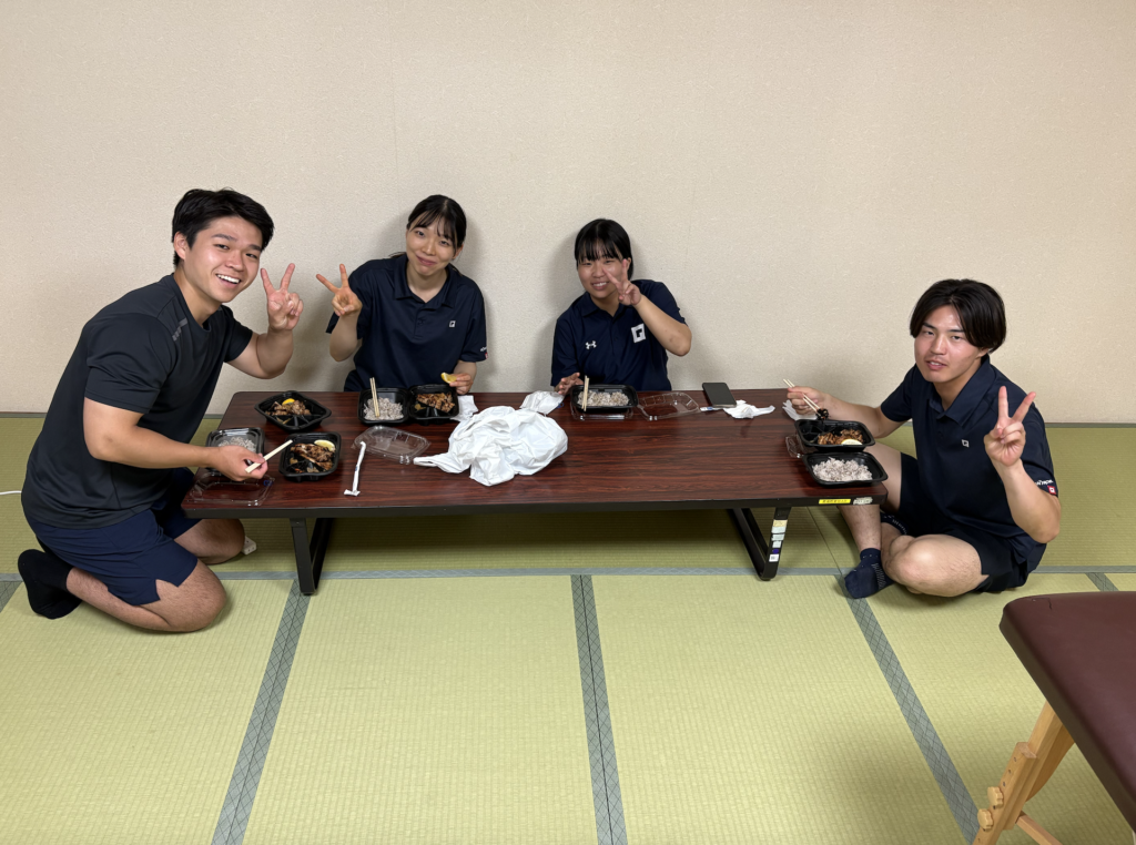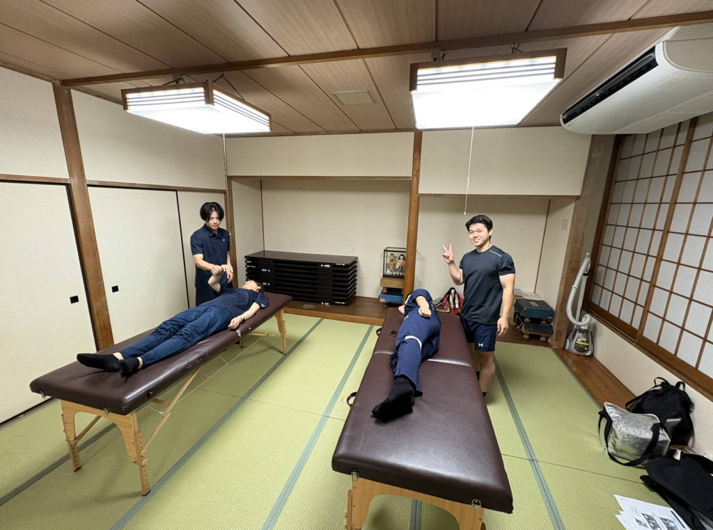選手の話を聞き、どのようなタイミングで痛みが出るのか、どの関節の動きが悪いか、弱くなっている筋力は何なのか。初めて選手に触る学生もいましたが、選手の力になろうと学生も必死で取り組んでいました!