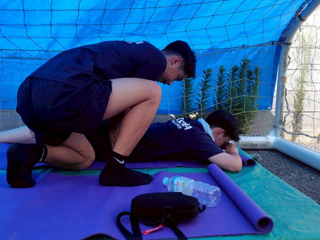 いきなり選手に触れる前に、仲間同士で練習したり確認したりもしています。
