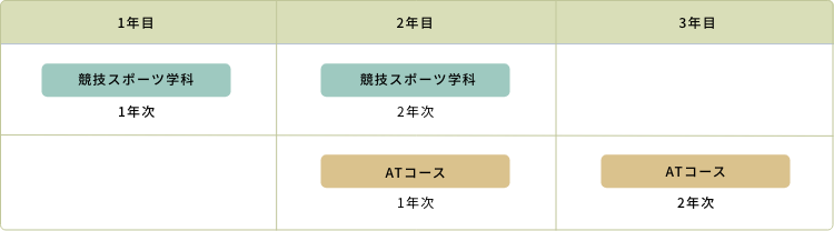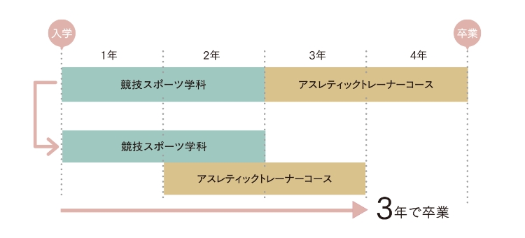 競技スポーツ学科(2年制)とアスレティックトレーナーコース(2年制)の合計4年間のカリキュラムを、あわせて3年間で修了できます。競技スポーツ学科で競技力を高めながら、チームに貢献できるトレーナーになることを目指します。