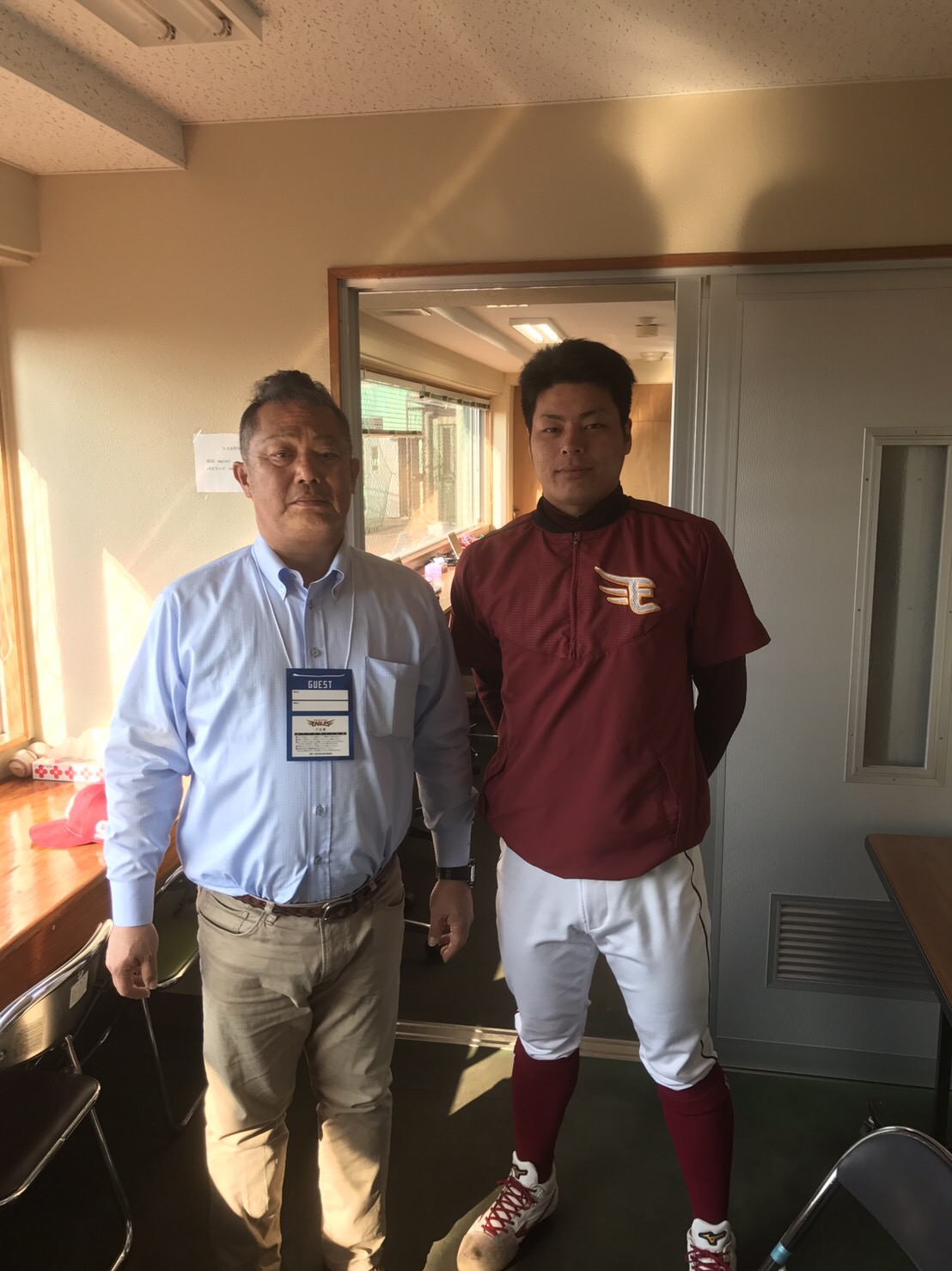 2017.03.01 近況報告♪♪ 東北楽天イーグルスに入団した木村先輩と 森岡監督の2ショットです!! 初めてのユニフォーム姿・・・・ プロ野球選手みたいでした!(笑)(プロ野球選手です) ピッチングの様子もとてもよく 指名された投手陣のなかでも期待の新人だそうです! 履正社学園にいるときにこのピッチングができていると 社会人もいけただろうなぁ と言っていました!! 支配下登録されるのを楽しみにしています 前の記事 記事一覧 次の記事