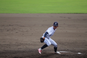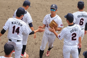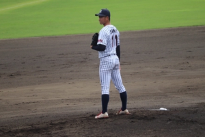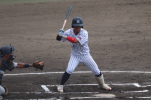 2番手の出崎は6回1アウト2塁から登板し、死球・ヒットで1アウト満塁のピンチとしますがしっかりと抑え、0点で切り抜けました。