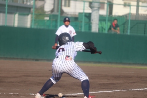 4回に先頭バッターの四球からチャンスをつくり、1番藤本の走者一掃のタイムリーと2番大森のスクイズで同点に追いつきます