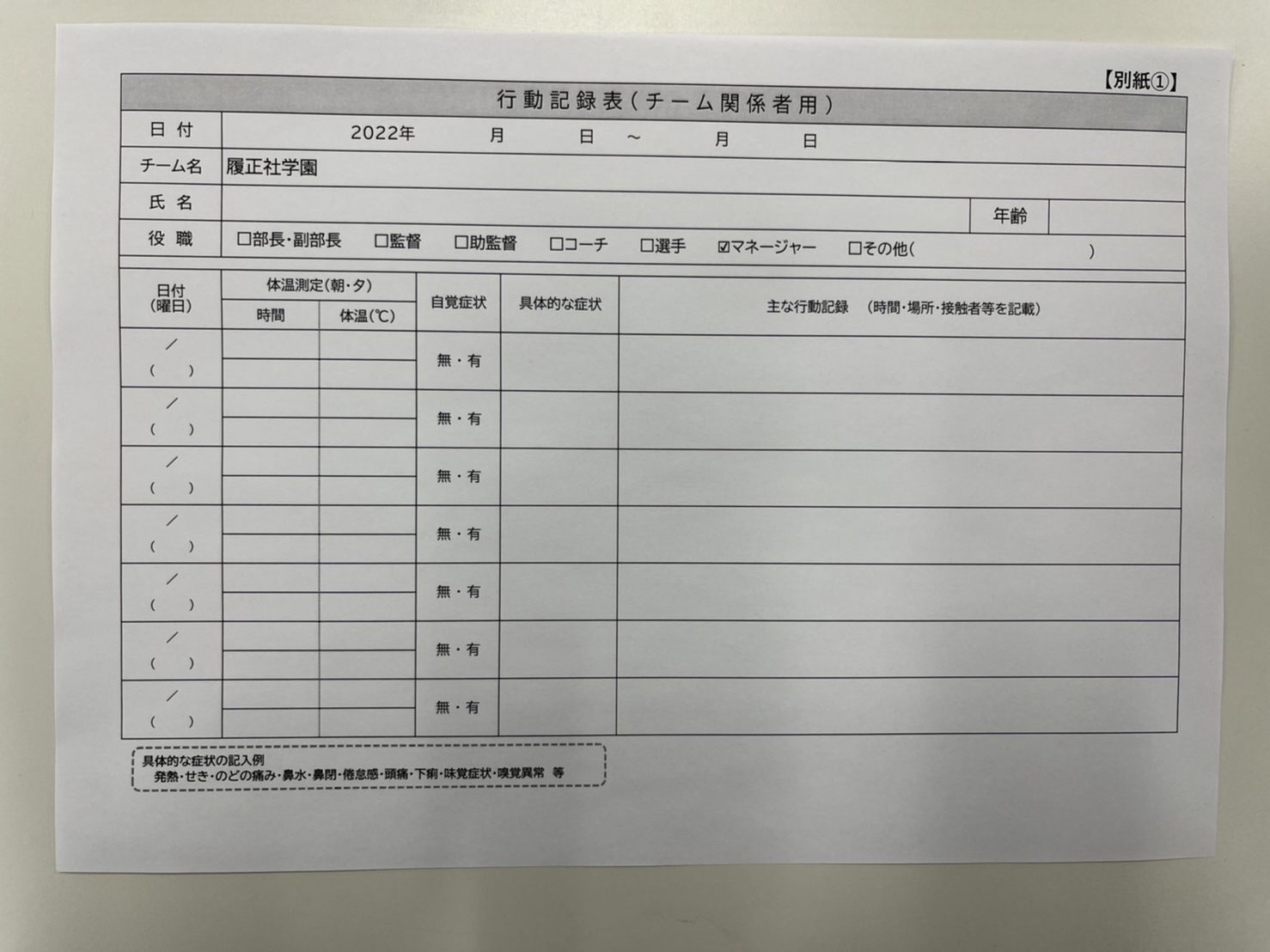 日本野球連盟の感染症対策ガイドラインに則り、大会前後2週間の行動や体温などを記入するのが「行動記録表」です。もし感染者が出た場合には情報提供するため、細かく記載する必要があります。