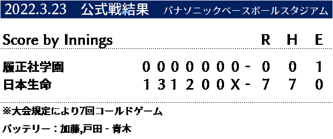 履正社学園の第2回戦 日本生命との試合結果をお知らせいたします。
