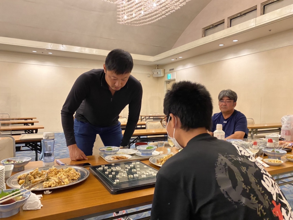 投手コーチ マック鈴木コーチと1年生外野手 荒川が将棋の対局を行っている様子です。