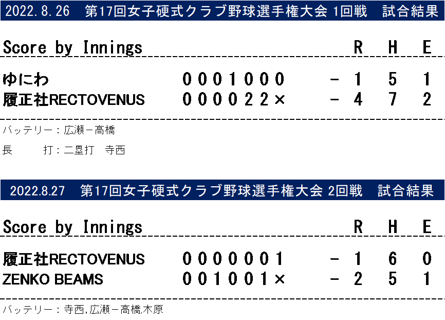 8月26日から千葉県にて開催された、全日本女子クラブ野球選手権大会の結果をお知らせいたします。