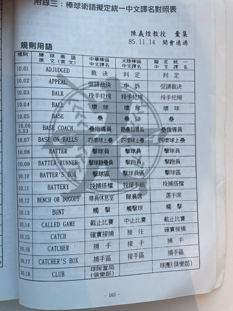 現地の方にお願いして、台湾語の野球用語リストを手に入れました。(写真は一部です)