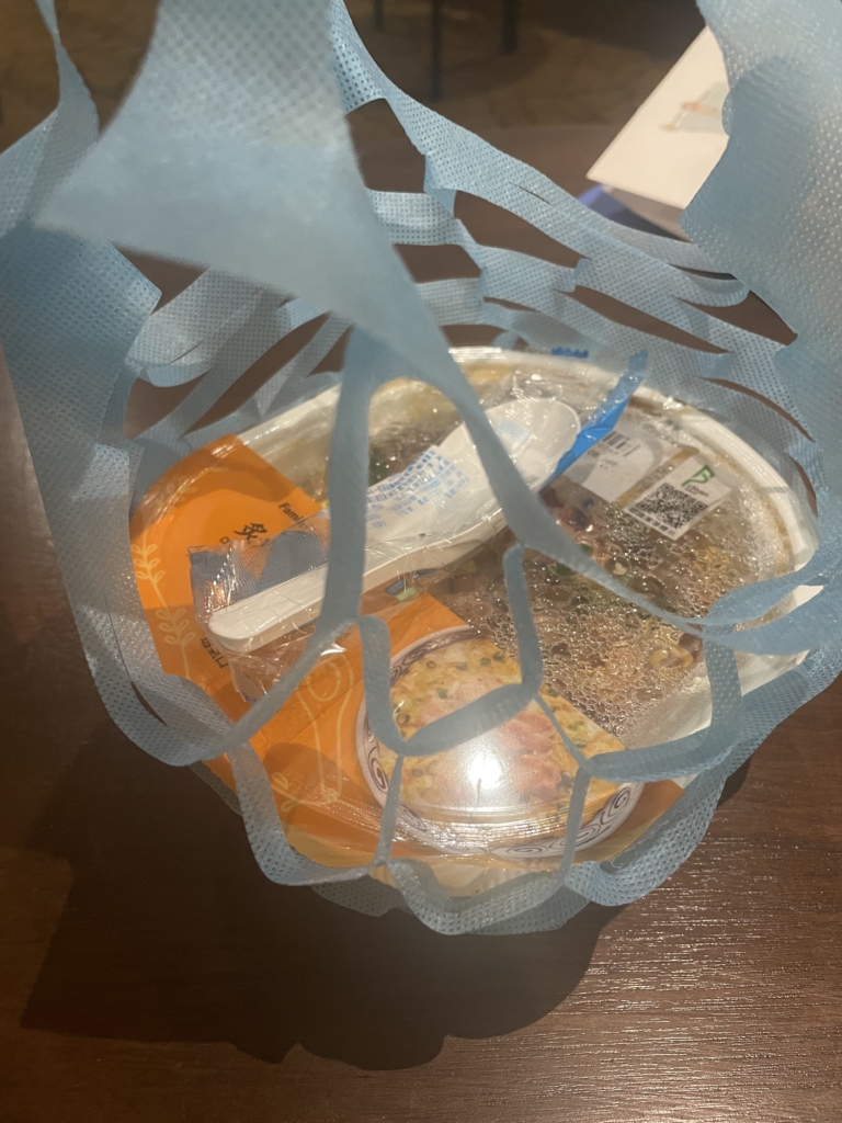 温めたお弁当類は、このような紙でできたネットに入れてくれます。