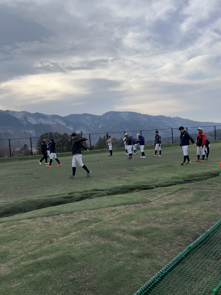 グラウンドも凍ってしまい使えなかったので、人工芝でアップやキャッチボール、ティーバッティングなどを行いました。