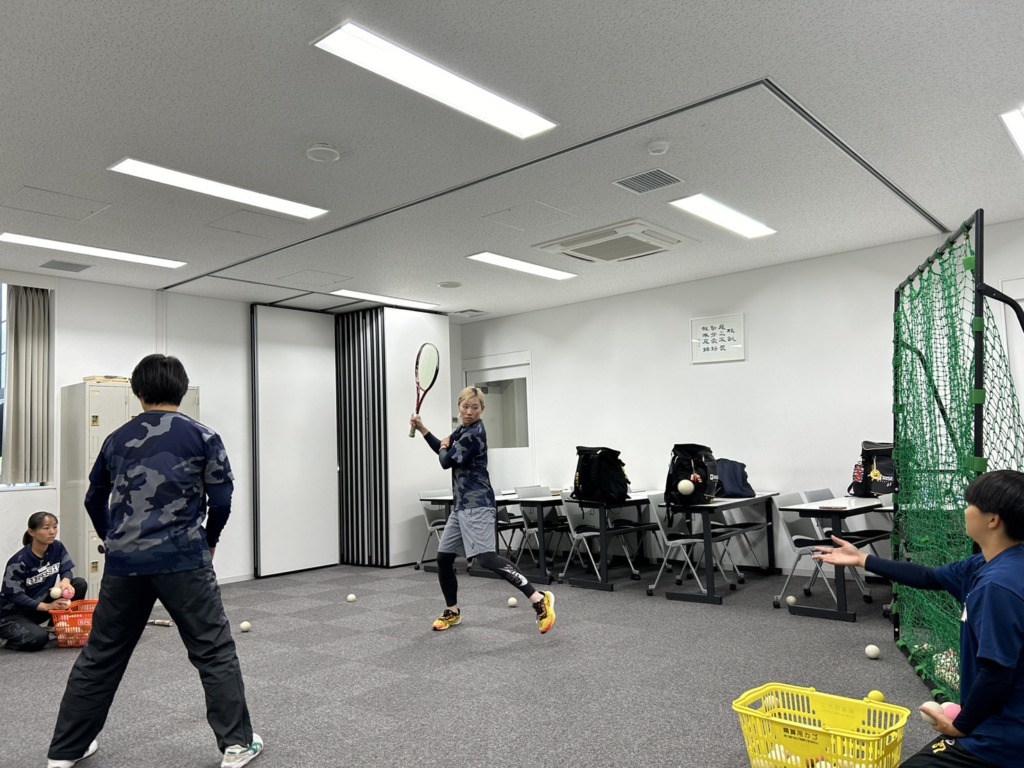 教室でテニスラケットを使ってソフトテニスのボールを打ちました。