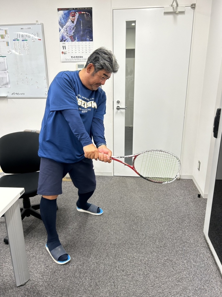 テニスラケットを使って野球のスイングをする。