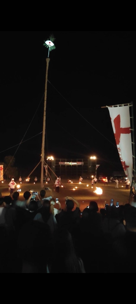夕食後には、このキャンプで大変お世話になっている中村荘の会長様のご厚意により、地元の伝統行事「都井岬の火祭り」に参加させていただきました。