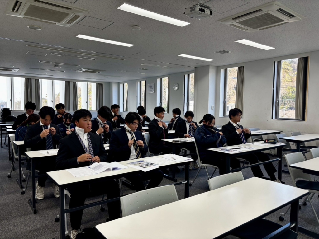 2026.01.08 洋服の青山「スーツの着こなし講座」 1/7(水)は 午前中は通常通り練習を行い 午後から野球コースのみ専攻の一年生を対象に就職ガイダンスが始まりました 初日の前半は中西先生に就職活動についてのお話をしていただきました 後半は 洋服の青山の店長さんにお越しいただき スーツの着こなし講座を行っていただきました 野球コースは2年制なので 一年生のこの時期から就活は始まります 危機感を持って行動し 一人でも多くの学生に納得する就職先が決まることを願っています。 前の記事 記事一覧 次の記事