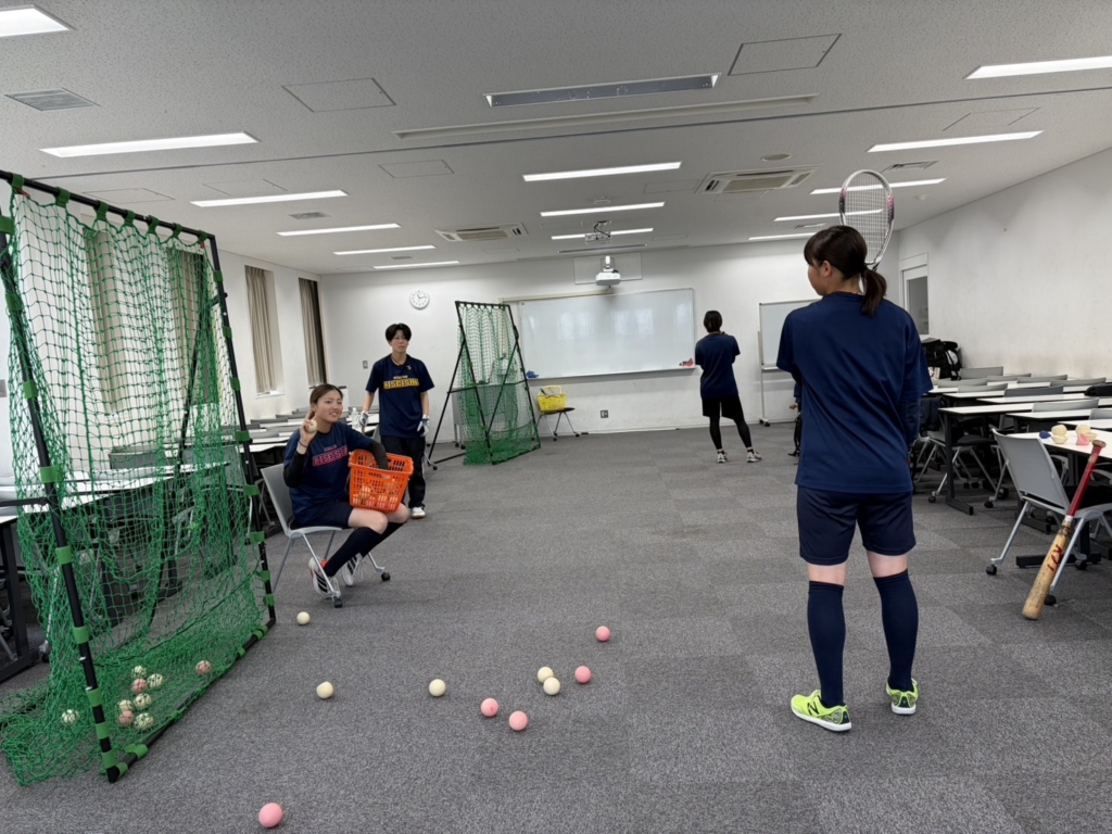 女子チームは室内で、テニスボールやラケットを使った工夫したバッティング練習を行いました