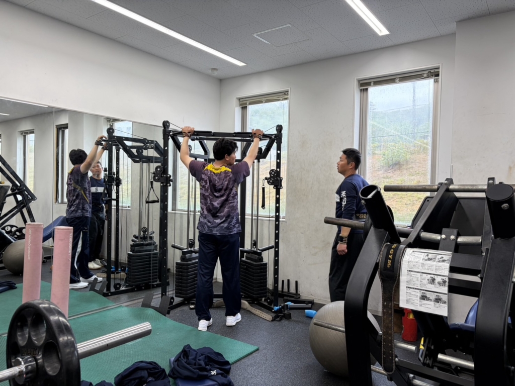 男子はポジションごとに分かれて練習を行い、ピッチャーは食堂で松井先生の指導のもとトレーニングを実施