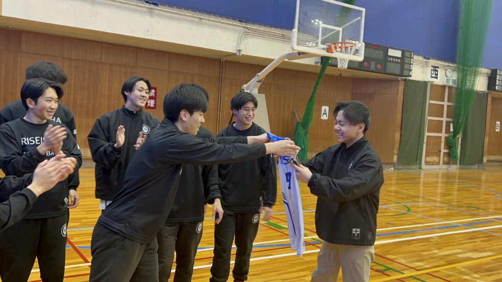 学生コーチの土居くんへユニフォームをプレゼントしました