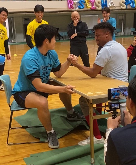 その中で、外国語学科ジャレット先生と腕相撲をするというお題がありました。